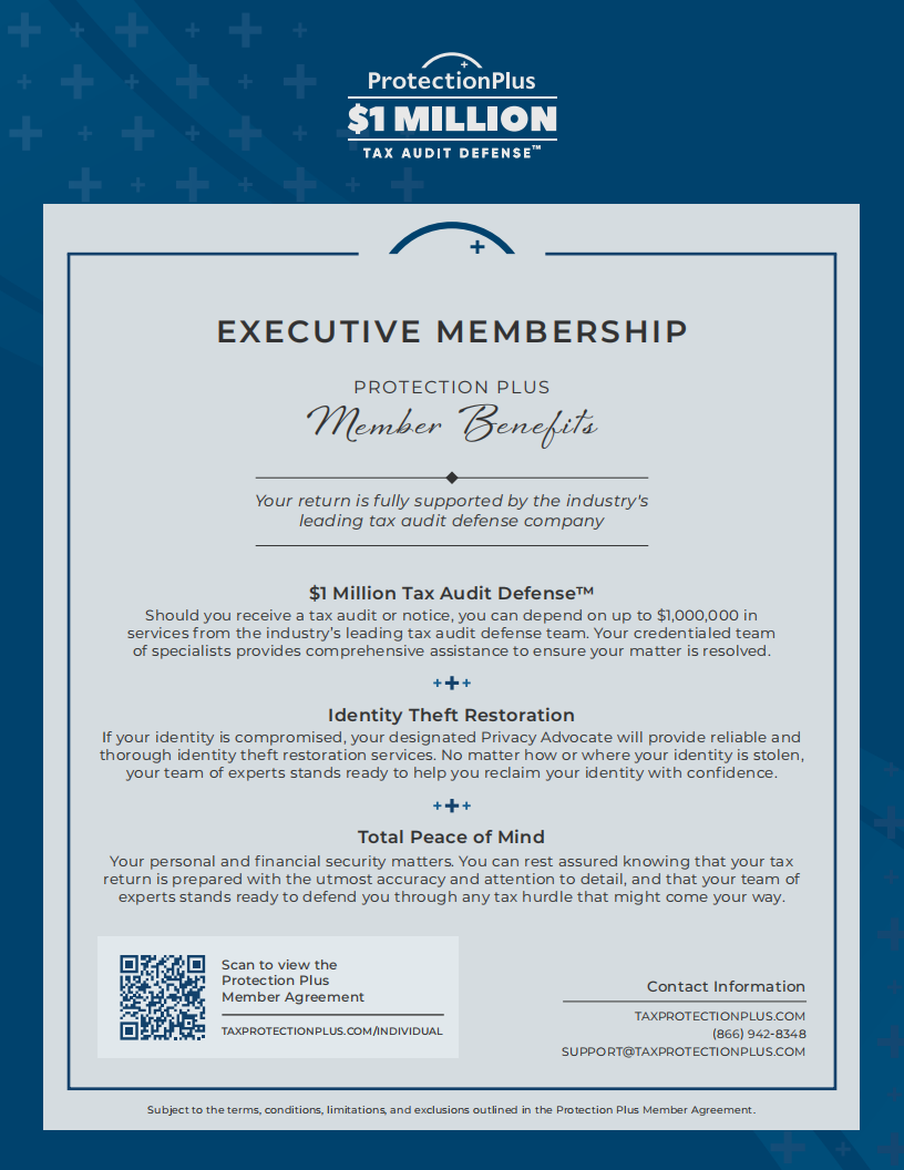Yes. Every personal tax return we file automatically includes the Protection Plus Executive Membership at no additional charge. It's our commitment to your long-term financial security.